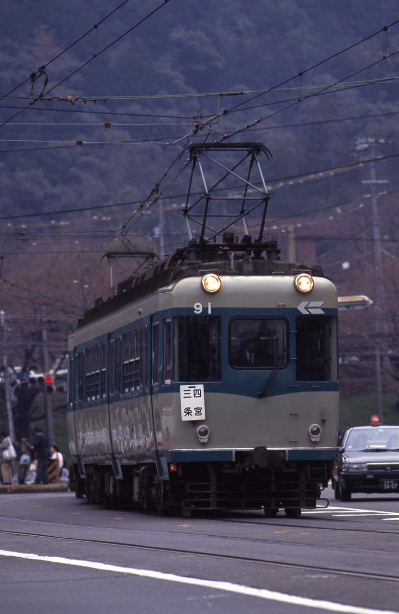 ↓ 今になって改めて写真を見ると、地下化されるために併用軌道でなくなる京都市内ばかりで撮ってまして、専用軌道の写真が一枚もない。撮影計画がなってないですね・・・。