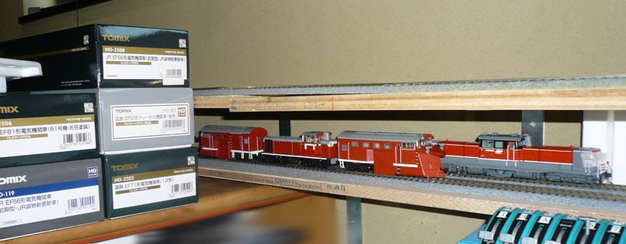 ↓ こちらも久々。ロクロクはパンタがちょっと傾いてました。早くレイアウトの2階部分の製作に着手せねば。
