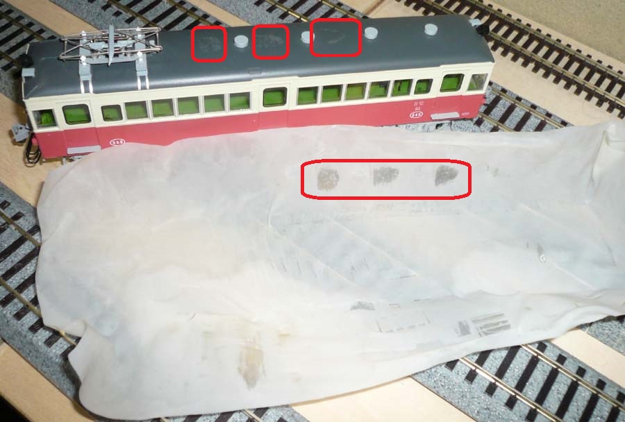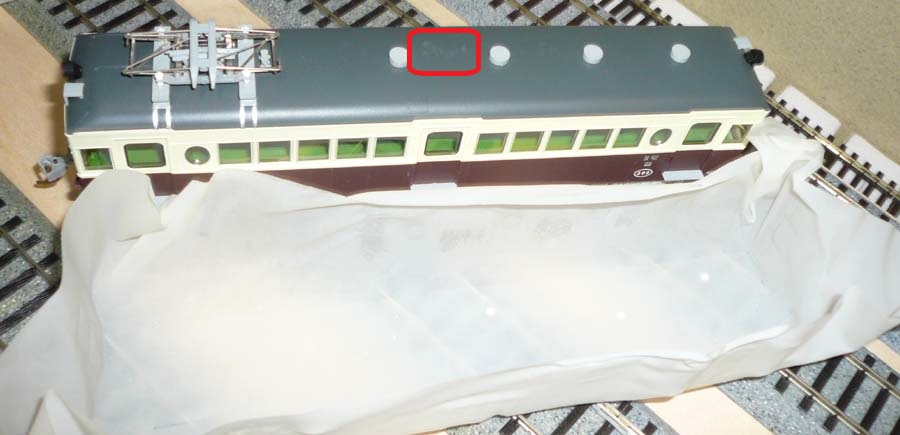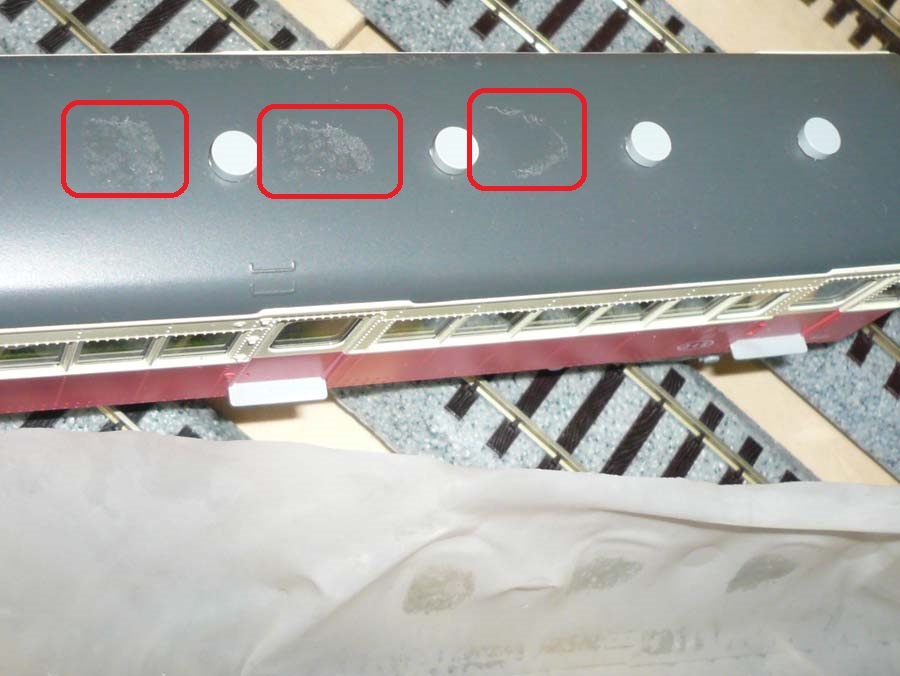 ↓ 悲しい出来事が起こってました。こちらもかなり久々に箱から取り出したのですが、緩衝シート?が屋根に癒着しておりまして、そっと剥がしてみたのですが、しっかり跡が残ってしまいました。