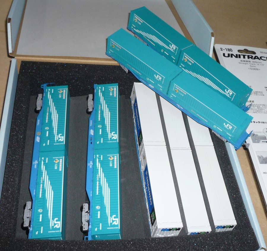 ↓ 手持ちのコキ100、200系は110両ほどあるのですが全車コンテナ満載状態なので、同じコンテナを載せているのを選んでコンテナを交換していくことにします。同じものばかりが載っているのは見ていて圧巻ではあるのですが、やっぱり色々載っている方が見ていても楽しいですからね。