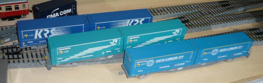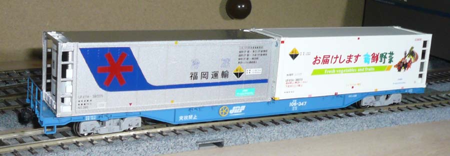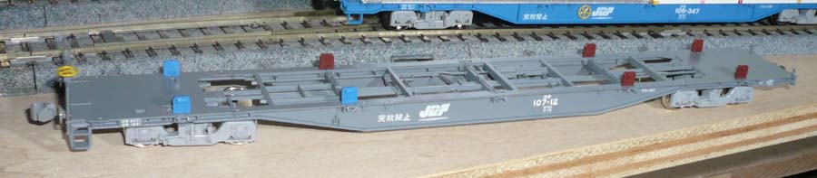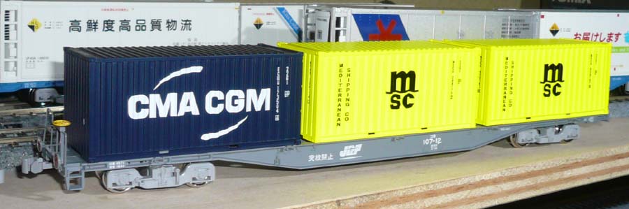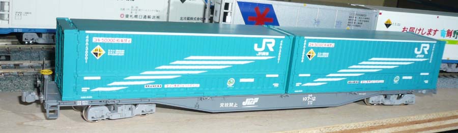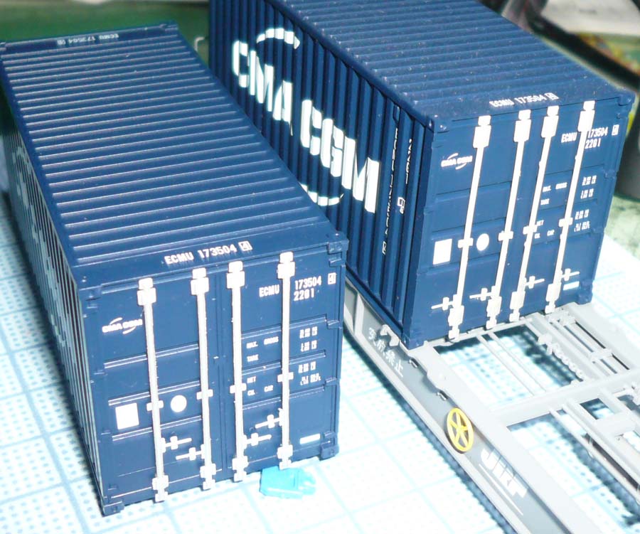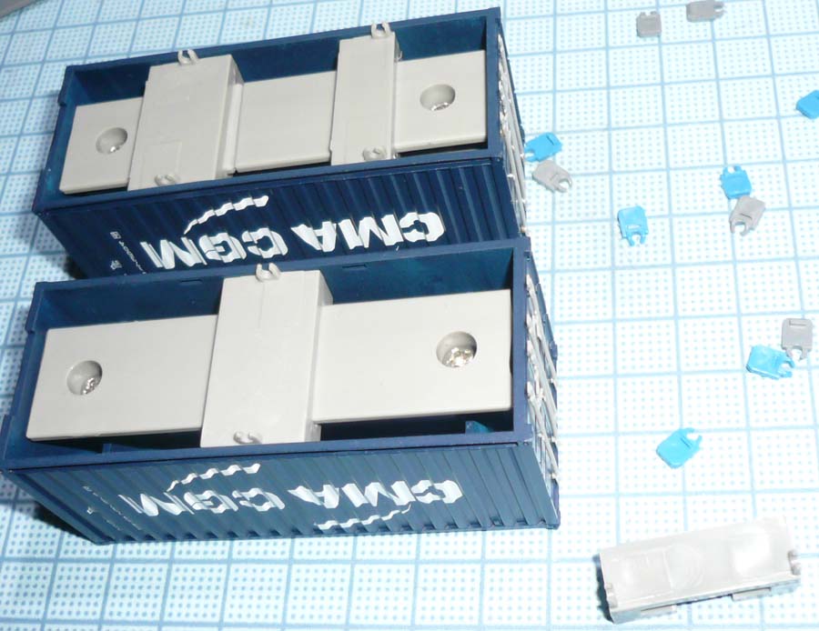 ↓ コキ1両に3個積みにする場合、中央に載せるコンテナは固定用のパーツを1つに減らす必要があります。