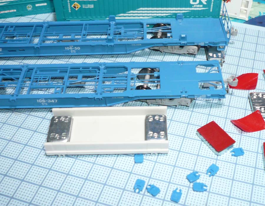 ↓ せっかくの週末ですが朝から雨天で撮影にも行けず、久々に模型弄りをしてみました。先日見つけていたリーファーコンテナをコキに載せていきたいと思います。ウェイトも買い置きしてあったものを引っ張り出してきました。