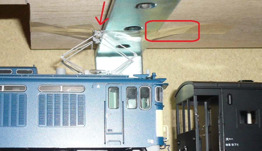 ↓ ちょうど矢印の箇所で、うまくスリ板を金具の下まで誘導してくれるので、これまでパンタが高めに上がる車両を走らせると「カツン」とスリ板がL字金具に当たる音が聞こえていたのですが、これが皆無になりました。あとは左側の合板断面にも勾配を付ければさらに効果が期待できます。最終形はセロハンテープの代わりに細いリン青銅の線材を金具に半田付け、その端部を上向きに曲げておいて天井部分の合板にあけた穴に差し込む形にしようかと考えています。