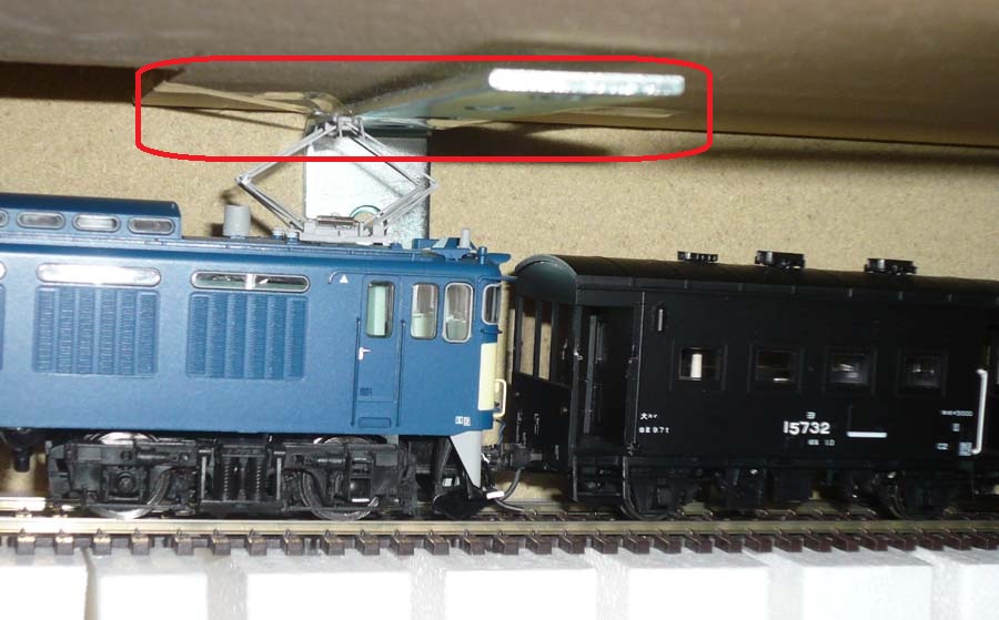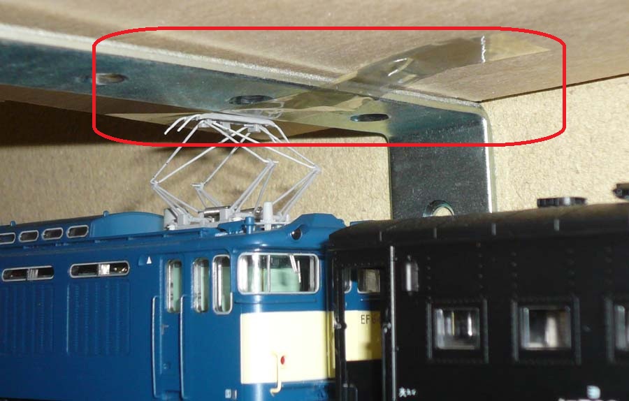 ↓ 作りかけのレイアウトで懸念事項になっていたのが、1階と2階を繋ぐ勾配の立ち上がり箇所にあるL字金具にパンタグラフが引っ掛かる件。頭の中で簡易対策 (というと大袈裟ですが) を考えてはいたものの、実際にはやれていませんでした。で、走らせる度に引っ掛かってパンタを破損する車両が発生してましたので、ようやく簡易対策を講じた次第です。何をやったかはご覧の通りで、長めに切ったセロハンテープで天井部分に勾配を作って、L字金具の断面にパンタのスリ板が当たらないようにしただけです。