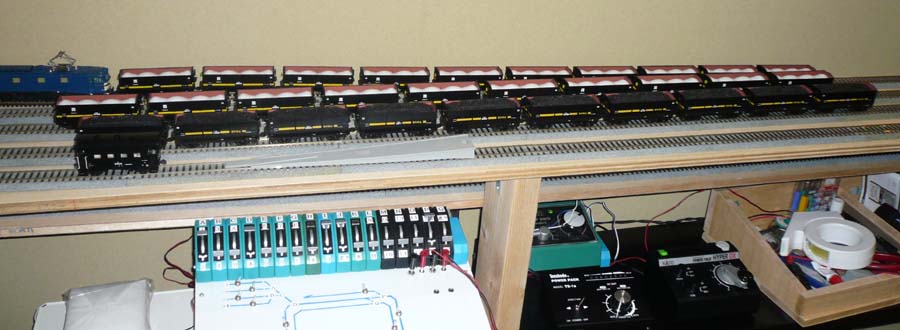 ↓ 違う角度から見るとこんな感じ。合板にセロハンテープ貼付けなので粘着力がいつまで持つのかはかなり不安ですが、実際に走らせてみると、簡易対策ながら効果は絶大でした。