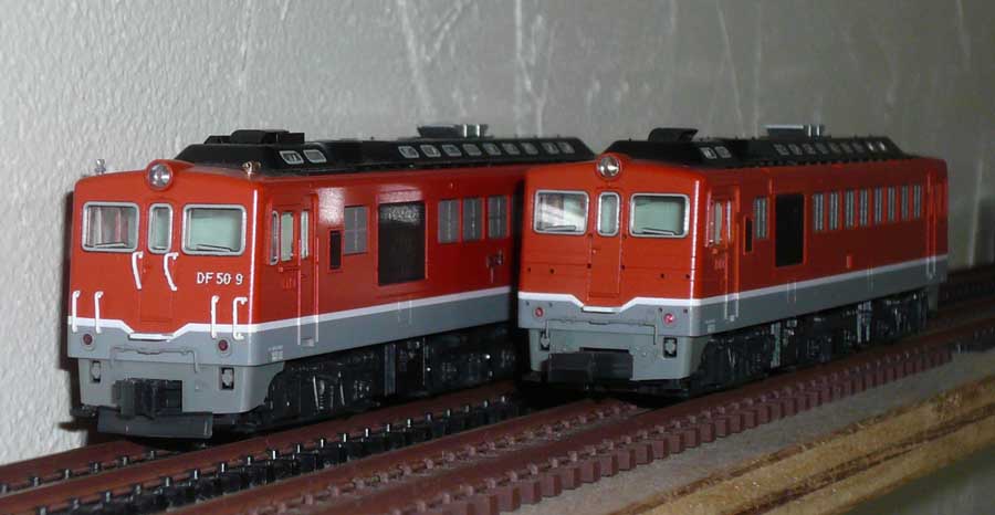 ↓ 続いてDF50の普通型?(左)と四国型(右)の並び。四国型の特徴である全面補強に長い開放テコ、2エンド側だけに付いていたジャンパ栓受、雨どいなど、並べると違いがよくわかります。