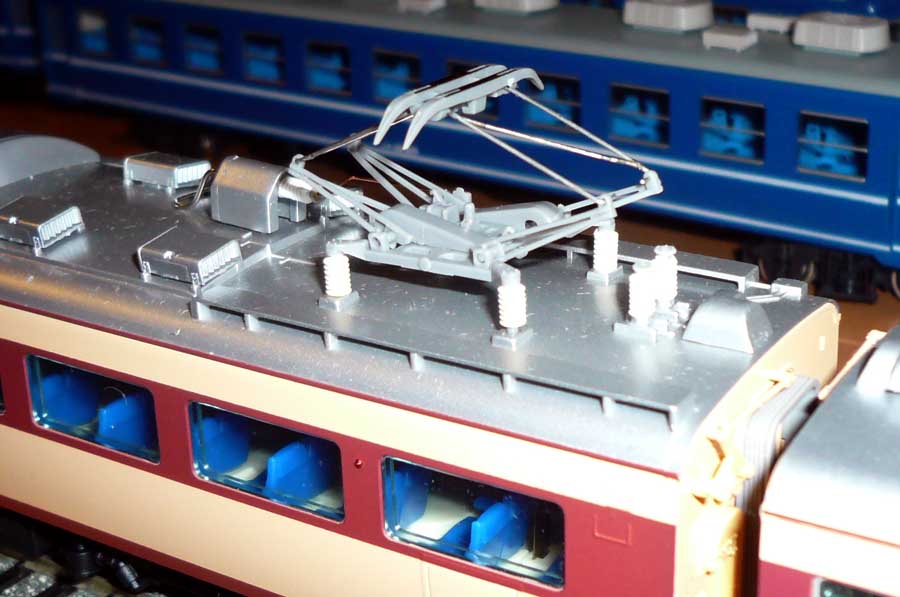 ↓ モハ484のパンタ周り。車内のシートも肘掛まで再現されています。デカいとここまで出来るんですね。でもそれが価格に反映されてくるので悩ましいところです。HOだと簡単にNと一桁違ってきますんで・・・。