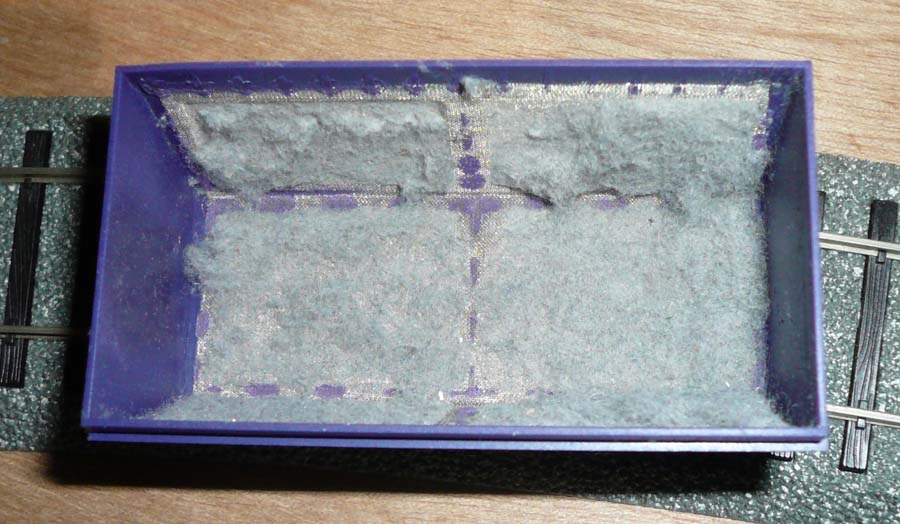 ↓ 前々回に紹介したレールクリーニングカーの集塵効果を確認する試運転です。控車代わりに手元にあった客車や貨車を控車代わりに連ねて、その先端にクリーニングカーを連結。隠しヤードの奥まで入線させてみます。