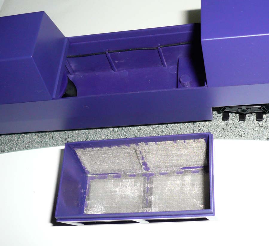 ↓ 先日入手したクリーニングカー、以前加古川線で撮影したマヤ検のような編成を組んでみました。このクリーニングカーはパワーパックの電圧を上げると内臓モーターの回転も上がるので、あまり「軽く」走る動力車と組み合わせると集塵効果が低くなるようなので、ウチの動力車では一番重たそうなのがこのキハ35だったので、こんな編成になりました。