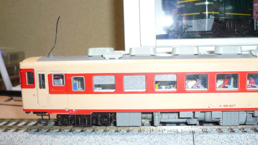 ↓ 乗客も多数乗車していて、よい雰囲気です。この画像ではわかりませんが、室内灯も特殊な回路が組み込まれているらしく、停止しても30秒程度は点灯したままになります。これが今回の目玉商品でした。5年ほど前だったか、ホビセンがキハ35に同じようなセットを搭載したカスタム製品を売り出したのが異様に興味を引いたのですが、その時はかなりHOよりに移行しかかっていたので、購入には至りませんでした。今回、ひょんなことからモニターまでセットされた一式で入手することが出来たのは、ラッキーでした。自宅にこのセットを活用できる最低限の常設レイアウトもあるので、自宅にいながらにして手軽にこういうものが楽しめることになったのはうれしいことです。