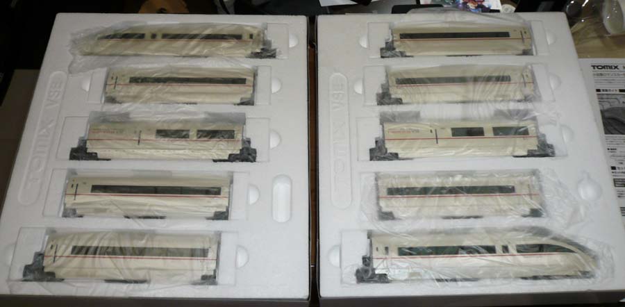 ↓ 「限定品」とかいてありますが、最初からフル編成なのがよいです。室内灯も組み込み済みでユーザ取り付けパーツのハシゴも取り付け済み、ナンバーも貼り付け済みと、最近ものぐさになったアタシにとってはありがたい仕様です。全車に室内灯組み込みと考えると、かなりお買い得かも。