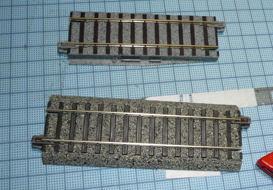 ↓ 早速S114レールの両肩部分を切断してみました。これは古いタイプのユニトラックなので、枕木が別モールドになっており、肩部分をえぐり過ぎると枕木の間にある砂利をモールドした部分がバラけてしまう、という事態になるので、枕木横に少し余裕を持たせた部分をフリーハンドで切断していきました。