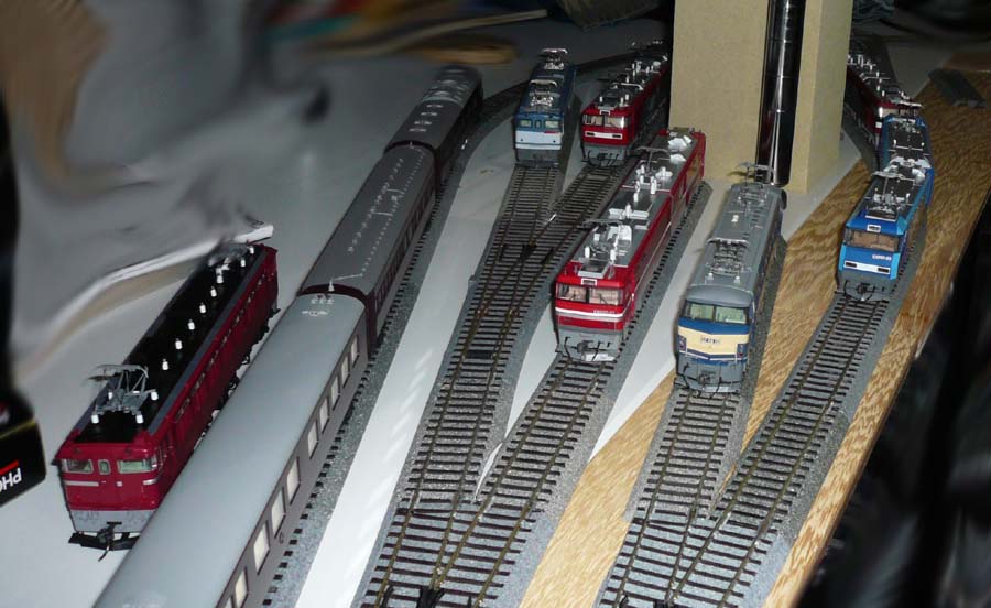 ↓ ワム80000もKATO製を全部引っ張り出したら40両ありましたので、全部繋げたものとセキを並べ、EH10各タイプがスタンバイ。