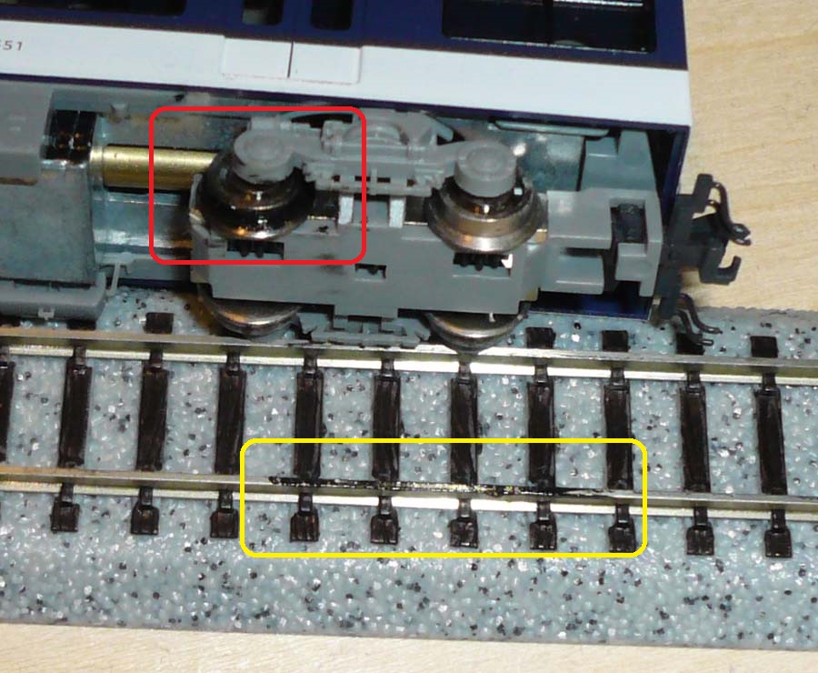 ↓ で、直前に周回させた車両を確認するとこんなことになってました。トラクションタイヤのゴムが解けており、それがレールにこびりついておりました。試しに順番待ちしていた車両で同じ症状が出ているものをレールに押し付けた状態で通電してみたのがこれです。はっきりとレール面上に黒い汚れが固着。
