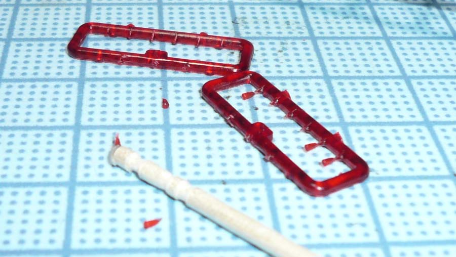 ↓ 車側灯の取付からはじめます。部品が小さいので、ルーペ越しに作業です。以前難儀したKATOのキハ82系と違って、とっても挿し込みやすいと感じました。