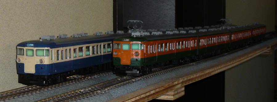 ↓ ちょっと後ピンですが。本線には、こちらも久々に引っ張り出した総武線色のE231系が走行中。113系も湘南色とスカ色を組み合わせて、無理矢理東京口の15連フル編成を組んでみたものです。このヤードは最大有効長20両なので、この15連は収容可能です。
