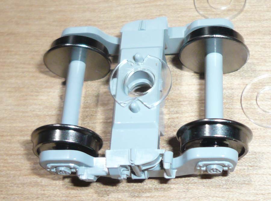 ↓ フリーハンドでカットしたので、切り欠きの大きさはマチマチですけど、台車に嵌めてみると、いずれも問題なし。この後組み込んでレールに乗せたところで、曲線レールを走行させると特定の場所で一方の台車が脱線する現象が発生しました。