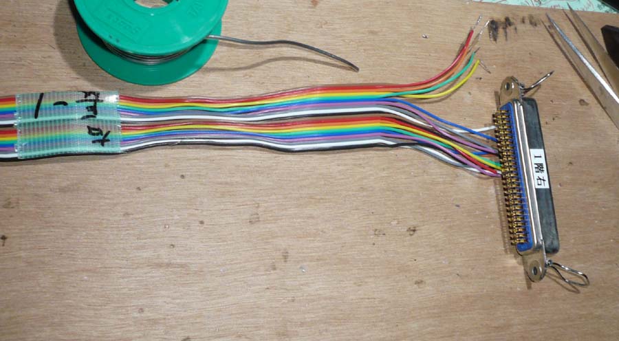 ↓ 電気配線の作業を続けます。コントロールパネルの配線が一通り終わりましたので、次はレイアウトのベースボード側の配線。受け側となるレセプタクルと呼ばれる側の半田付けです。手持ちにあった50Pを2つ使って左右に振り分けた配線にするので、先にコネクタに左右の区別を明記しておきます。