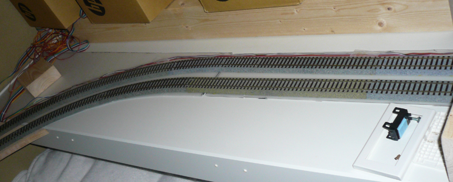 ↓ 部屋の入り口横の渡り線です。ここへのフィーダーの配線とポイントの切り替え確認が終わりました。